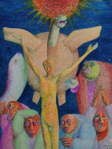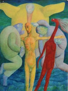 These two paintings made in Paris in 1954 are also strange. I remember the occasion. I had visited the Jardin des Plantes (Zoo) where a giant turtle floated upright in a tank of water which was several meters high. The experience of this creature which faced me was an emotional shock. It was like meeting another human but in disguise, or an angelic figure. This encounter was the origin of the paintings. Emotion clearly plays an important role in art, either caused from something seen or a memory.